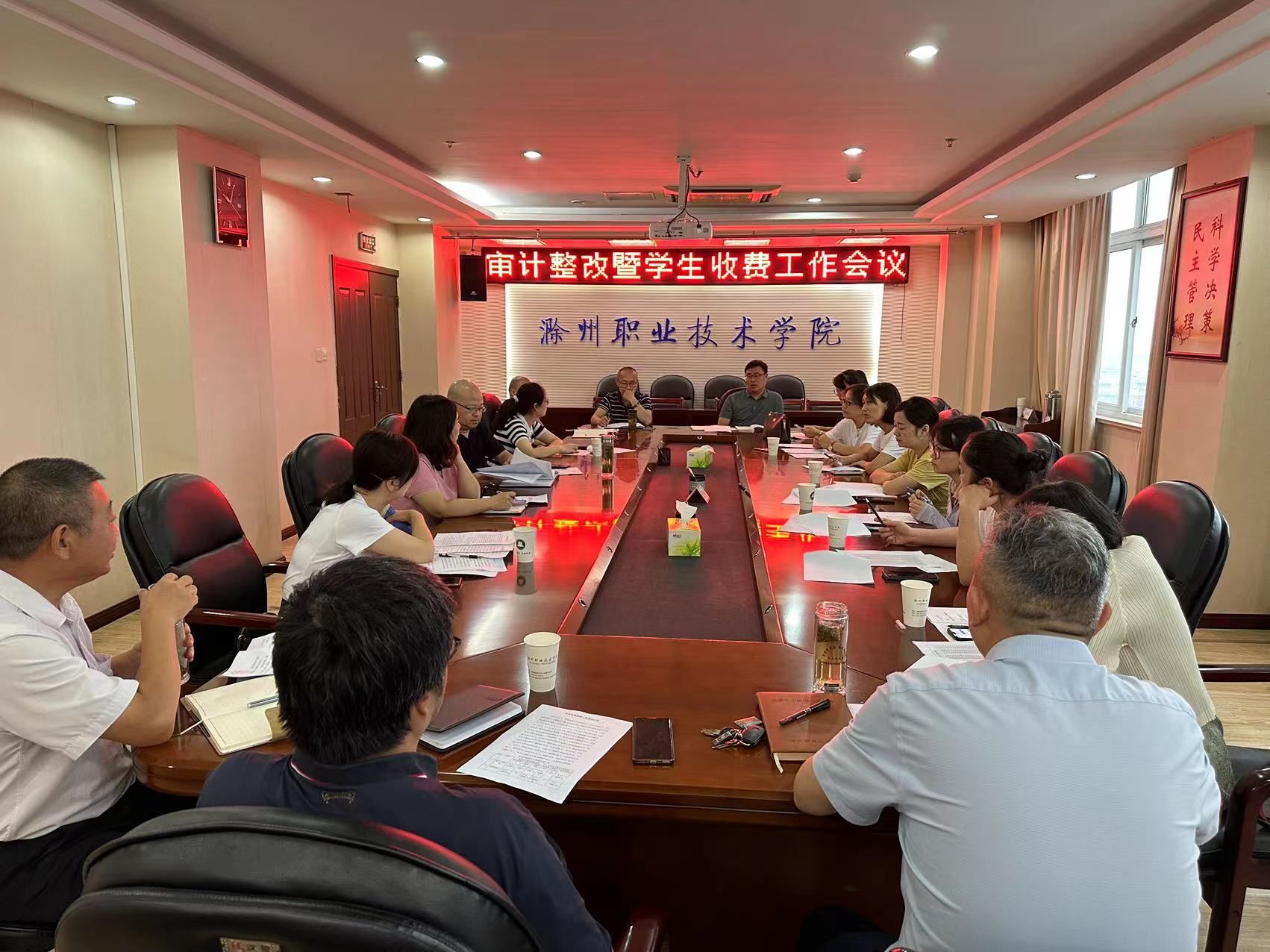 会上,计划财务处副处长梅道达汇报了学生欠费情况,并明确了要求及完成时间节点等。计划综合科科长陈晓燕汇报了《关于进一步规范学生欠费管理的通知》《学费清缴工作方案》,与会人员就具体问题进行了深入探讨。
