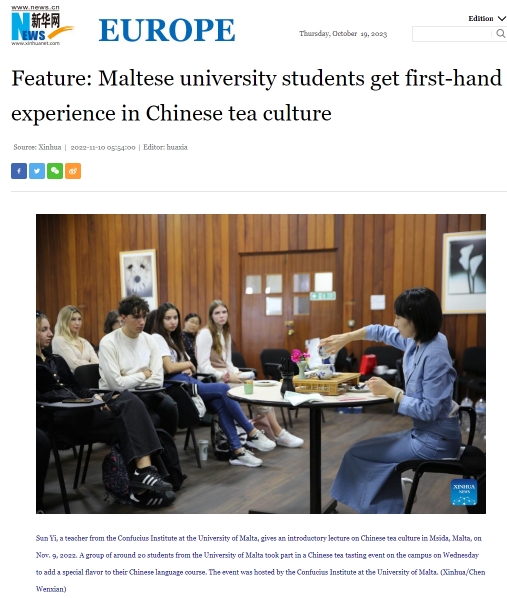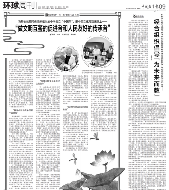 10月19日,《中国教育报》第9版“环球周刊”栏目,主版刊发了永利官网教师孙怡的署名文章“做文明互鉴的促进者和人民友好的传承者”,全文共3103字。文章以叙事探究的视角,分析了马耳他圣玛格丽特中学“中国角”师生学习中文、积极参与中马两国人文交流的案例,并就如何通过国际交流推进共建“一带一路”教育行动提出了自己的看法。