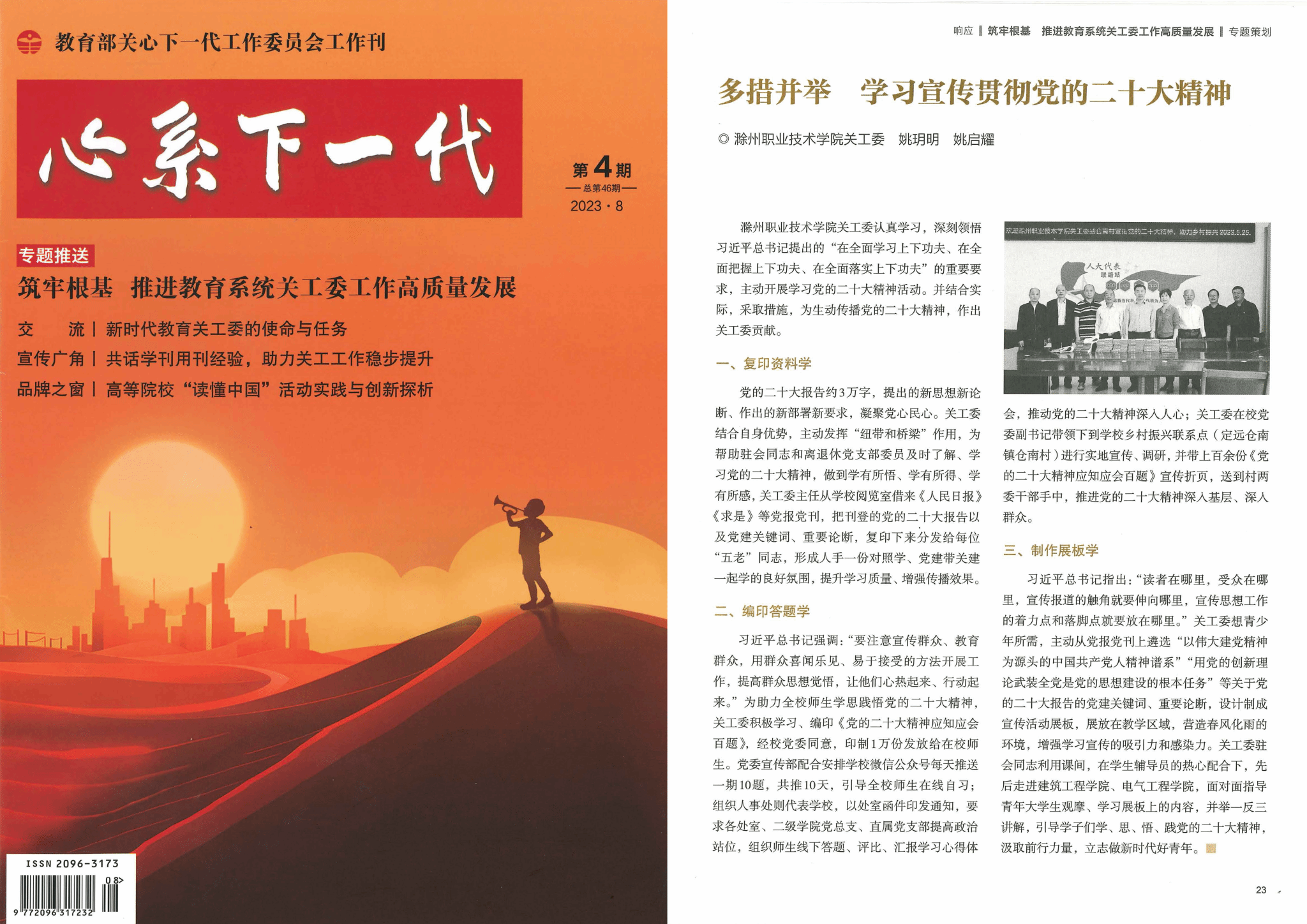 2023年是全面贯彻党的二十大精神的开局之年。中国关工委下发文件,要求各级关工委迅速掀起学习宣传贯彻党的二十大精神的热潮,并强调要把学习贯彻落实党的二十大精神同习近平总书记对关心下一代工作作出的重要指示批示精神结合起来,同落实中办国办《意见》结合起来。永利yl23411官网关工委在校党委的正确领导下,深刻领悟习近平总书记“在全面学习上下功夫、在全面把握上下功夫、在全面落实上下功夫”的重要要求,结合实际、采取措施,助推党的二十大精神宣传走深走实。具体做法得到教育部关工委的认可,并安排在《心系下一代》杂志第4期“专题策划:筑牢根基 推进教育系统关工委工作高质量发展”栏目刊发,这对宣传学校在全国教育系统影响力,起到积极作用。