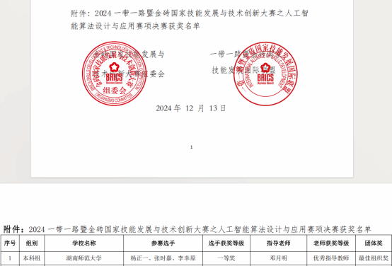 2024“一带一路”暨金砖国家技能发展与技术创新大赛之人工智能算法设计与应用赛项于 2024年11月25日圆满落幕。本次竞赛分为“人工智能算法设计模块”与“人工智能算法应用模块”两部分,有来自全国34个省级行政区域中职、高职、本科学校的264 支队伍、792人报名参加。互联网学院(隶属于信息工程学院)侯树兰、张晨老师指导的人工智能技术应用专业蒋冠峤、李浩,软件技术专业纪心月三位同学荣获国内总决赛高职组一等奖,侯树兰、张晨荣获优秀指导老师奖,永利官网获得最佳组织奖。