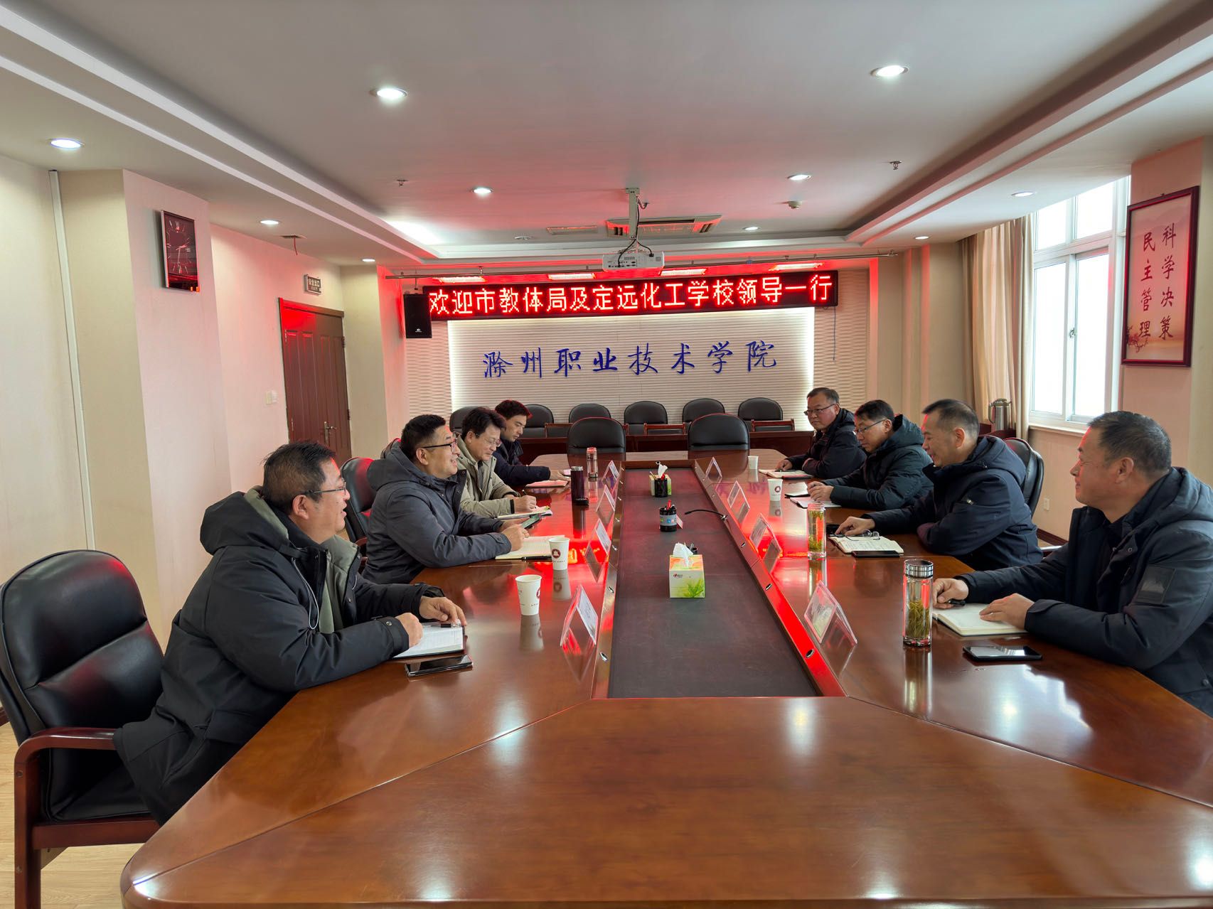 12月18日下午,滁州市教体局职成科科长蒋新华携定远化工学校党委书记许孝峰一行4人来永利官网交流。校党委委员、副校长苏有良,校长助理、招生就业处处长、安徽滁州职业教育集团秘书长穆松在804会议室接待了来访嘉宾。