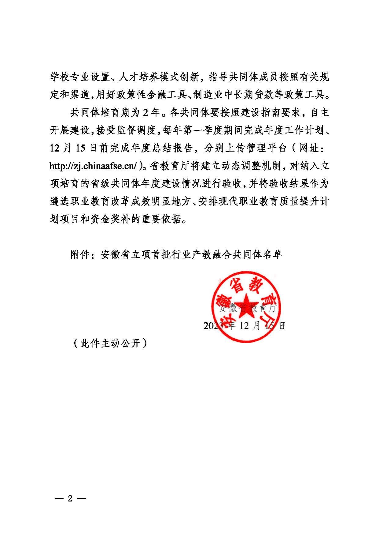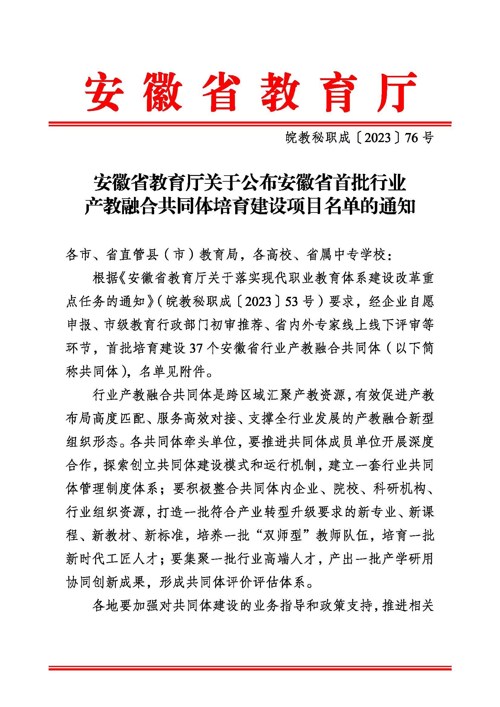 近日,安徽省教育厅发布《关于公布安徽省首批行业产教融合共同体培育建设项目名单的通知》,根据《安徽省教育厅关于落实现代职业教育体系建设改革重点任务的通知》要求,经企业自愿申报、市级教育行政部门初审推荐、省内外专家线上线下评审等环节,共评选出37个首批培育建设的安徽省行业产教融合共同体。