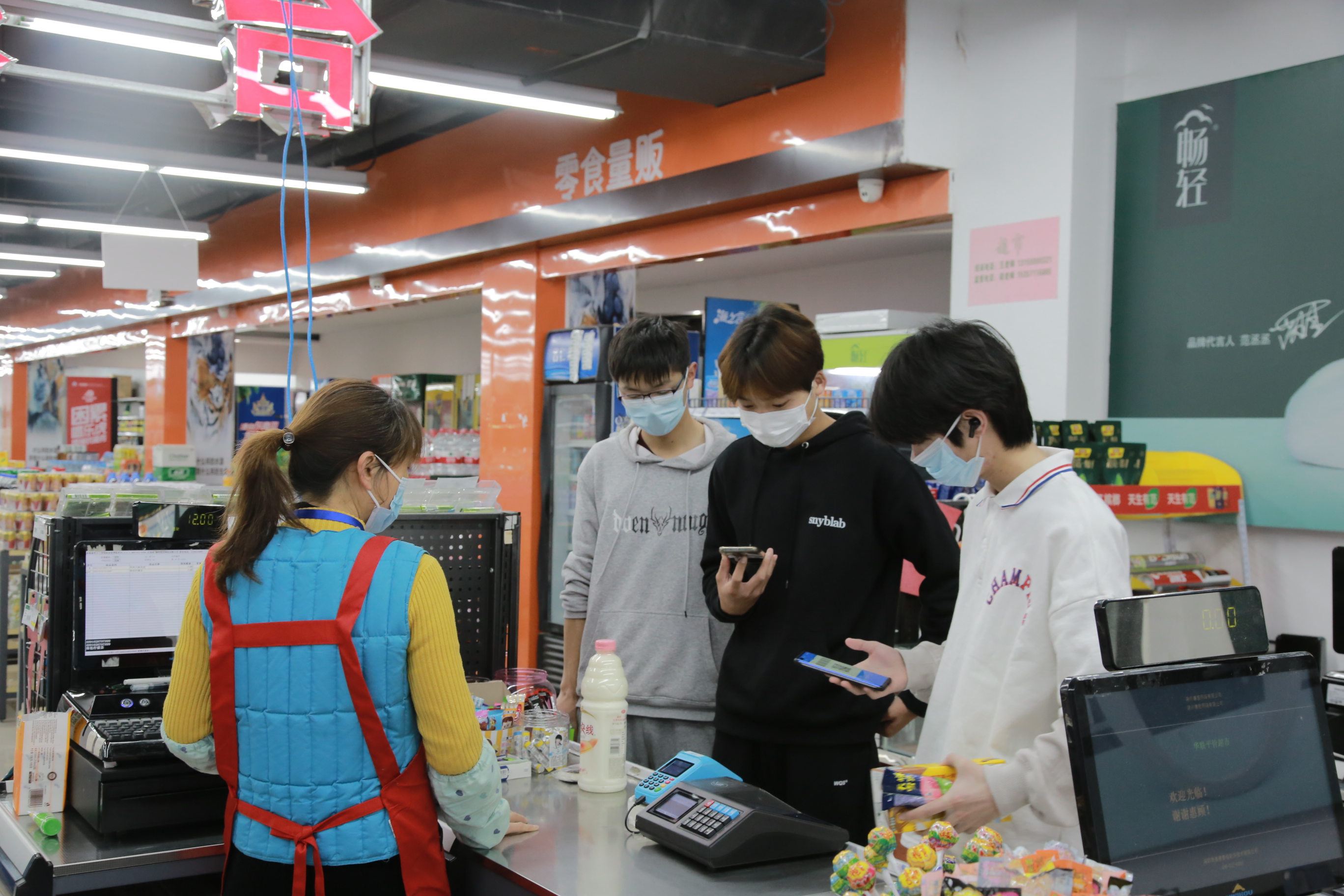 在校园超市,各种零食、生活用品、文具用品、常用百货准备充足,生鲜专区还摆满了草莓、香橙、苹果等新鲜水果,同学们有序采购,为日常生活储蓄能量。