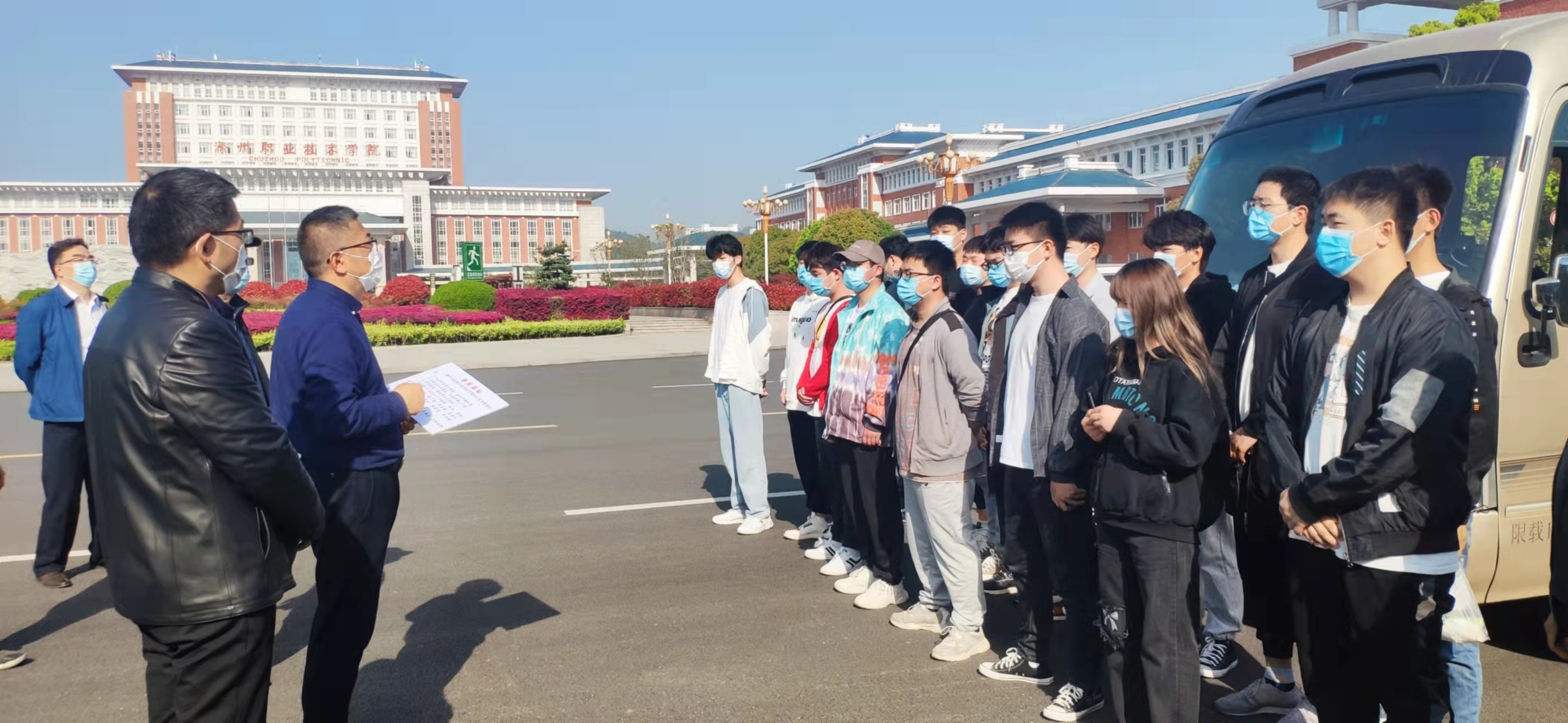 穆松对企业接车人员详细介绍学校疫情防控要求,叮嘱同学们一定要遵守市疫情办和学校疫情防控各项管理制度,认真完成实习任务,做到实习、防疫两不误。强调企业必须专车专人全程点对点接送同学们,中途不允许上下学生,车辆要每天早晚定时消毒,确保实习学生的健康安全。