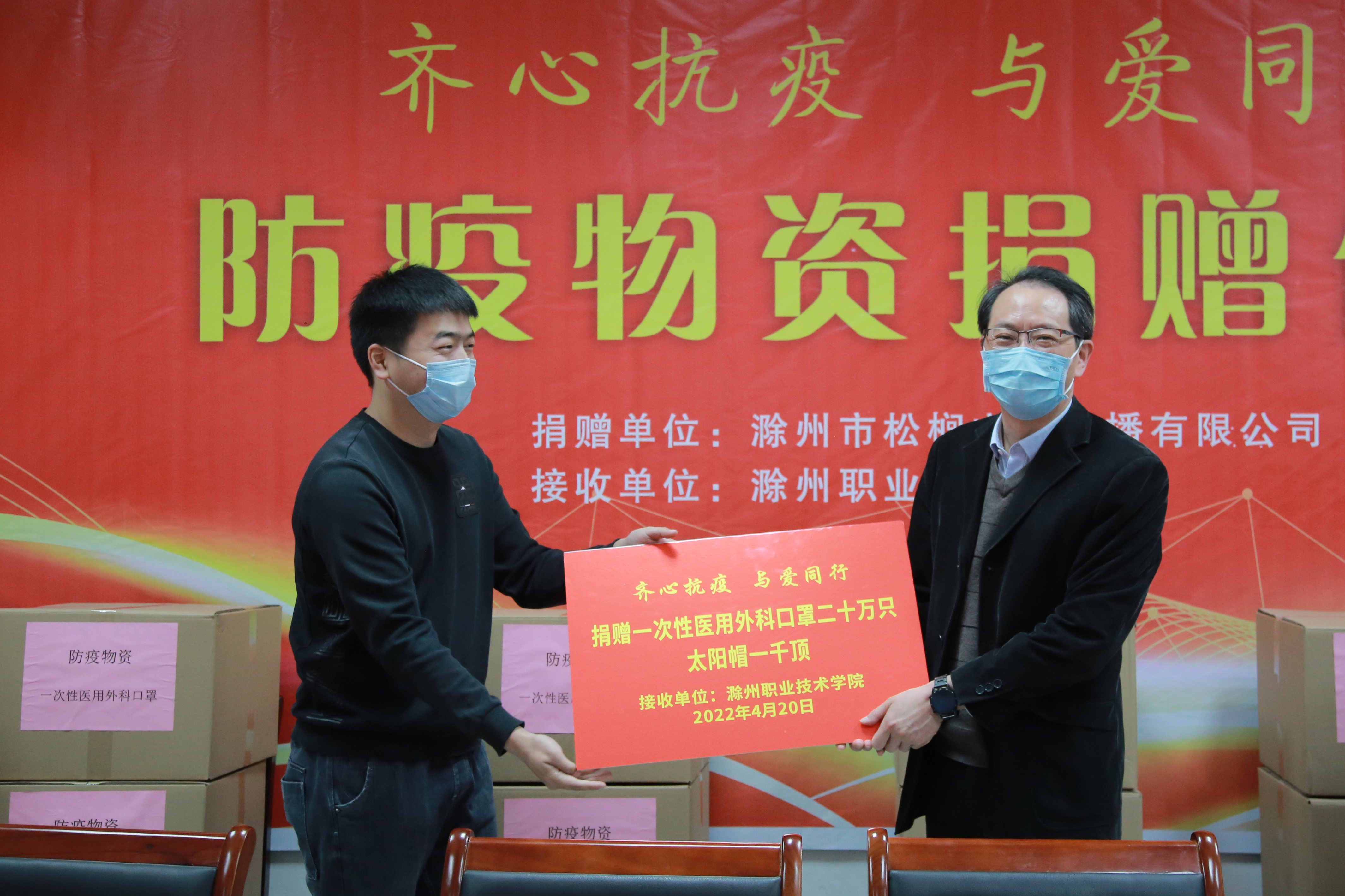 许雪峰代表学校向滁州市松榈文化传播有限公司颁发受捐证书,范世豪代表滁州市松榈文化传播有限公司向学校捐赠防疫物资。