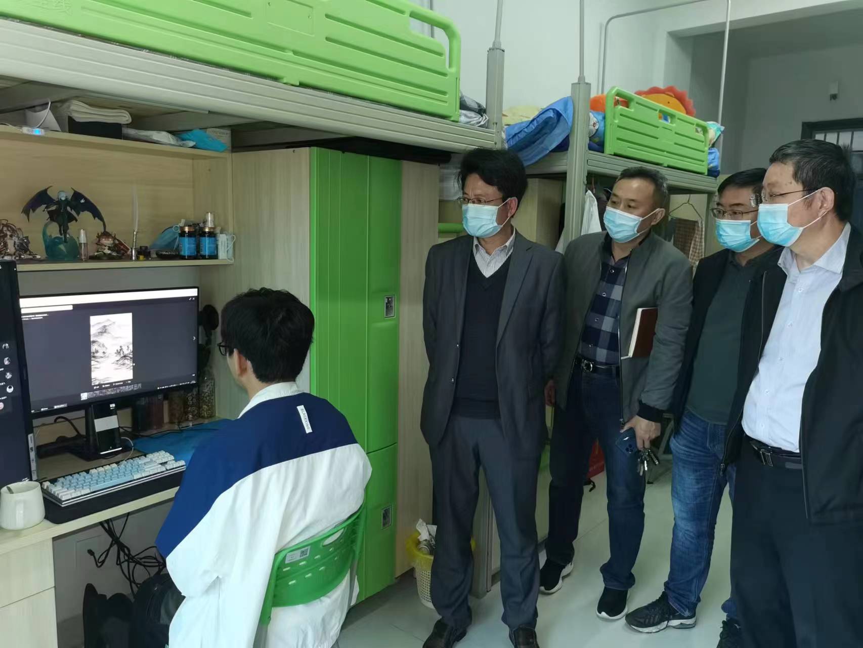 5月3日,校党委委员、副校长苏有良深入学生宿舍看望慰问学生,调研指导线上教学情况和疫情防控工作。上午8点,苏有良一行来到传媒与设计学院14号学生宿舍楼,20动漫专业、21室内设计专业学生宿舍进行走访详细了解线上教学开展情况。宿舍内,学生使用手机、电脑等终端设备已经登录曹明老师《中国画技法》线上直播教学平台,老师正在教授课程。苏有良与同学们亲切交谈,认真听取同学们对学校线上课程教学质量、封控期间学习生活情况的意见建议。鼓励同学们要适应新的教学方式,有问题要及时请教老师,端正学习态度,努力提高专业技能。