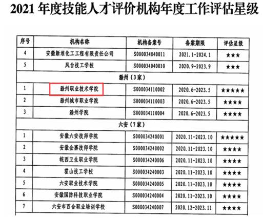 为进一步加强对职业技能等级认定社会评价机构的管理,提升职业技能认定质量,安徽省技能人才管理服务中心于2022年3月对全省职业技能认定社会评价机构开展2021年度工作评估。此次评估对象是针对全省154家社评组织(含全国性社评组织1家、省级行业社评组织8家、市级社评组织145家),获得五星级荣誉称号的有22家。在永利官网技能人才评价机构相关工作人员的不懈努力下,在继续教育学院所有同仁的共同协助下,永利官网评价机构在机构自评、市级评估和省级评比中,均取得优秀成绩,永利官网以高分被评为“五星级”社会评价机构。此次荣誉的获得极大地鼓舞了全体职工的工作热情,体现了团结协作的成教精神!让我们在以后的成教工作中,继续努力,齐心协力,再创辉煌!