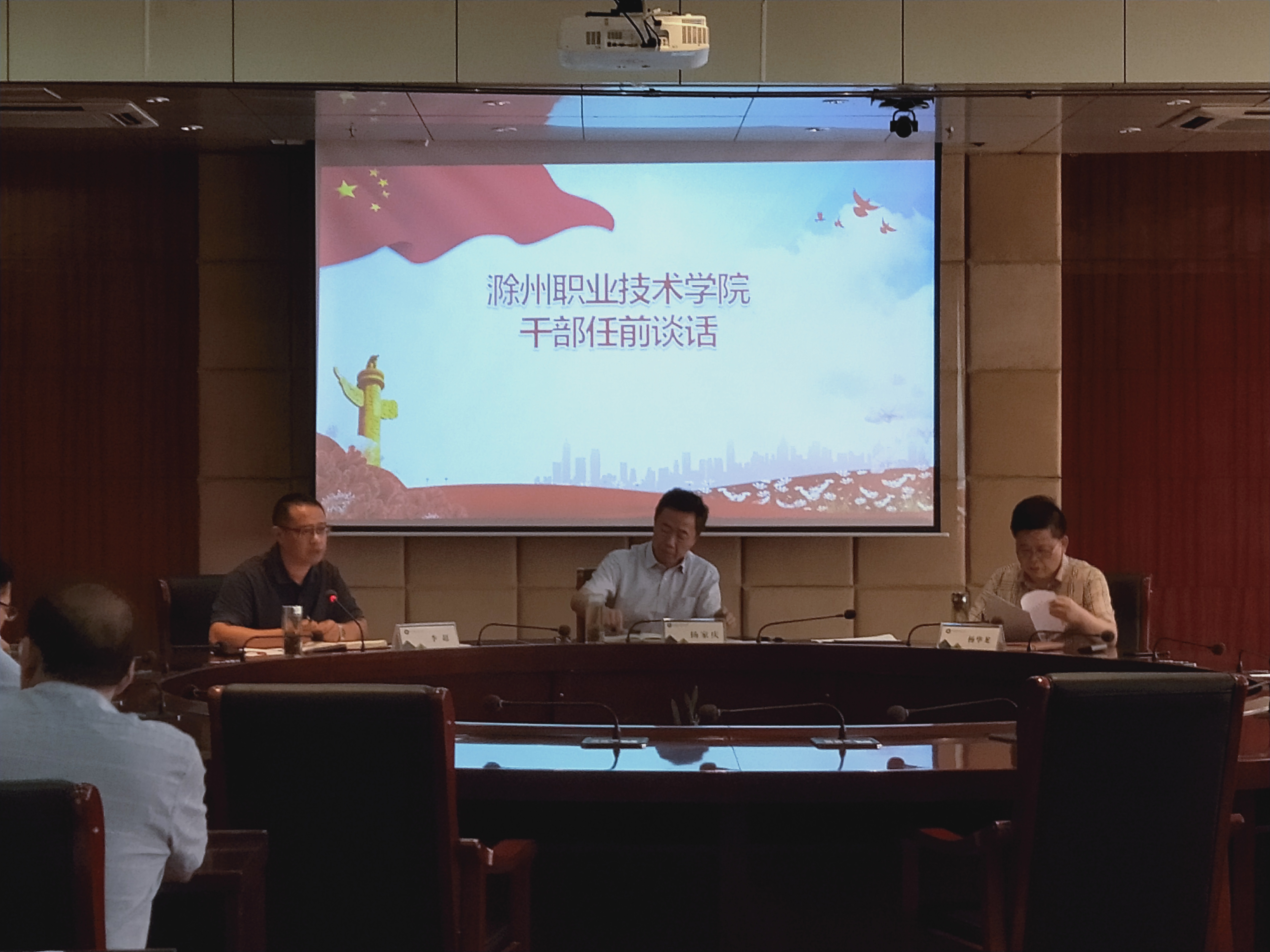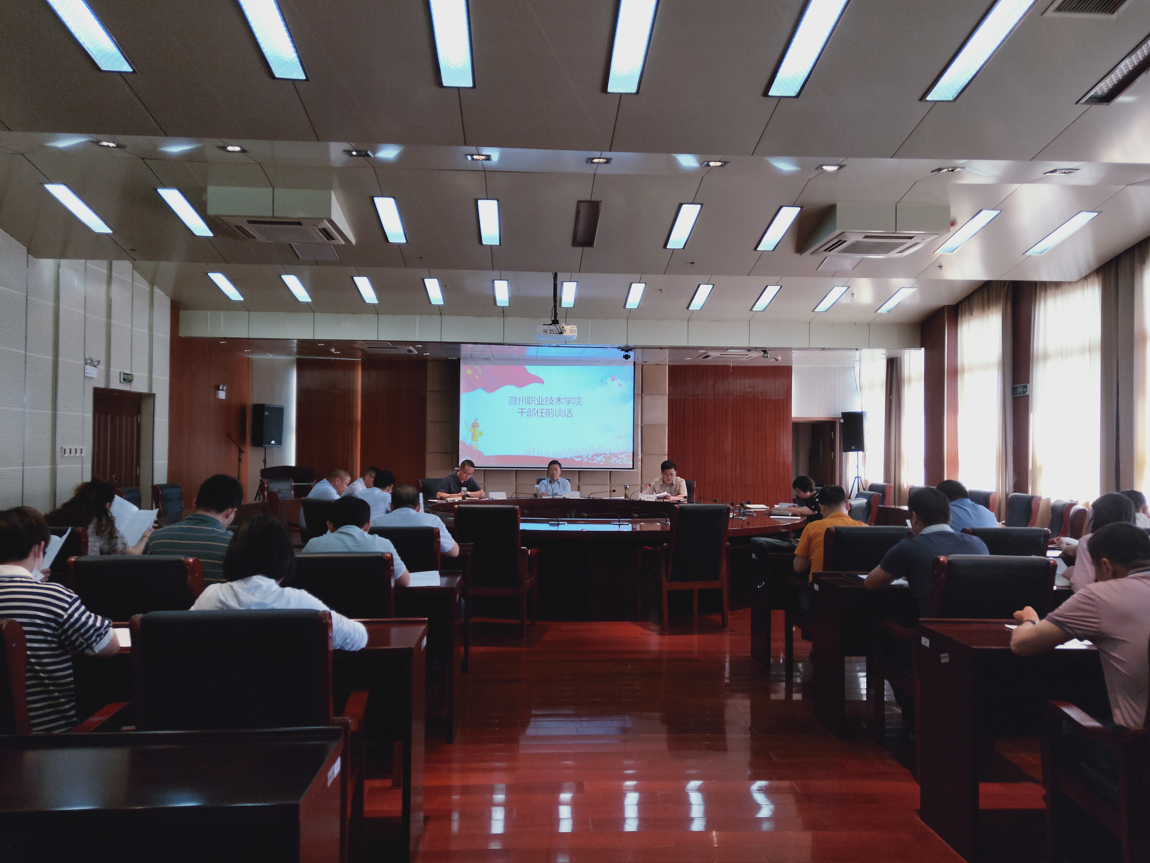 6月7日下午,校纪委会同组人处在综合楼11楼会议室举行干部任前廉政谈话,校党委副书记杨家庆,党委委员、纪委书记杨华龙出席会议,会议由党委委员、组织人事处处长李超主持,21位新任干部和7位调整岗位干部参加会议。