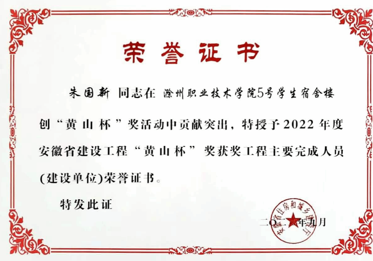 近期,永利官网建设的5号学生宿舍楼由滁州市住房和城乡建设局推荐申报2022年度安徽省建设工程“黄山杯”奖,最终顺利获评并被安徽省住房和城乡建设厅授予2022年度安徽省建设工程“黄山杯”奖(省优质工程)荣誉证书。永利官网朱国新同志在创“黄山杯”奖活动中贡献突出,同时被省住建厅授予2022年度省“黄山杯”奖获奖工程主要完成人员(建设单位)荣誉证书。