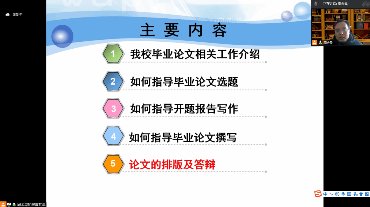 周金星教授对安徽科技学院新修订的《安徽科技学院本科生毕业论文(设计)工作管理办法(修订)》进行了解读,围绕政策要求、论文选题、开题报告、指导方法和排版答辩等方面工作作了全方位、深入浅出的讲解。以安徽科技学院在指导本科生毕业设计中遇到的常见问题为例作对论文选题、开题报告、毕业论文正文各部分内容、排版格式、答辩工作等环节进行了阐释。周教授强调要高度重视本科生毕业设计(论文)的指导,加强诚信教育,要去结合实习工作,选择新颖课题,加以研究,培养提升学生学科综合能力和解决实际问题的能力。报告结束后,周教授还与永利官网教师在线进行了深入的交流,解答了永利官网教师在指导毕业设计(论文)工作中的问题与困惑。