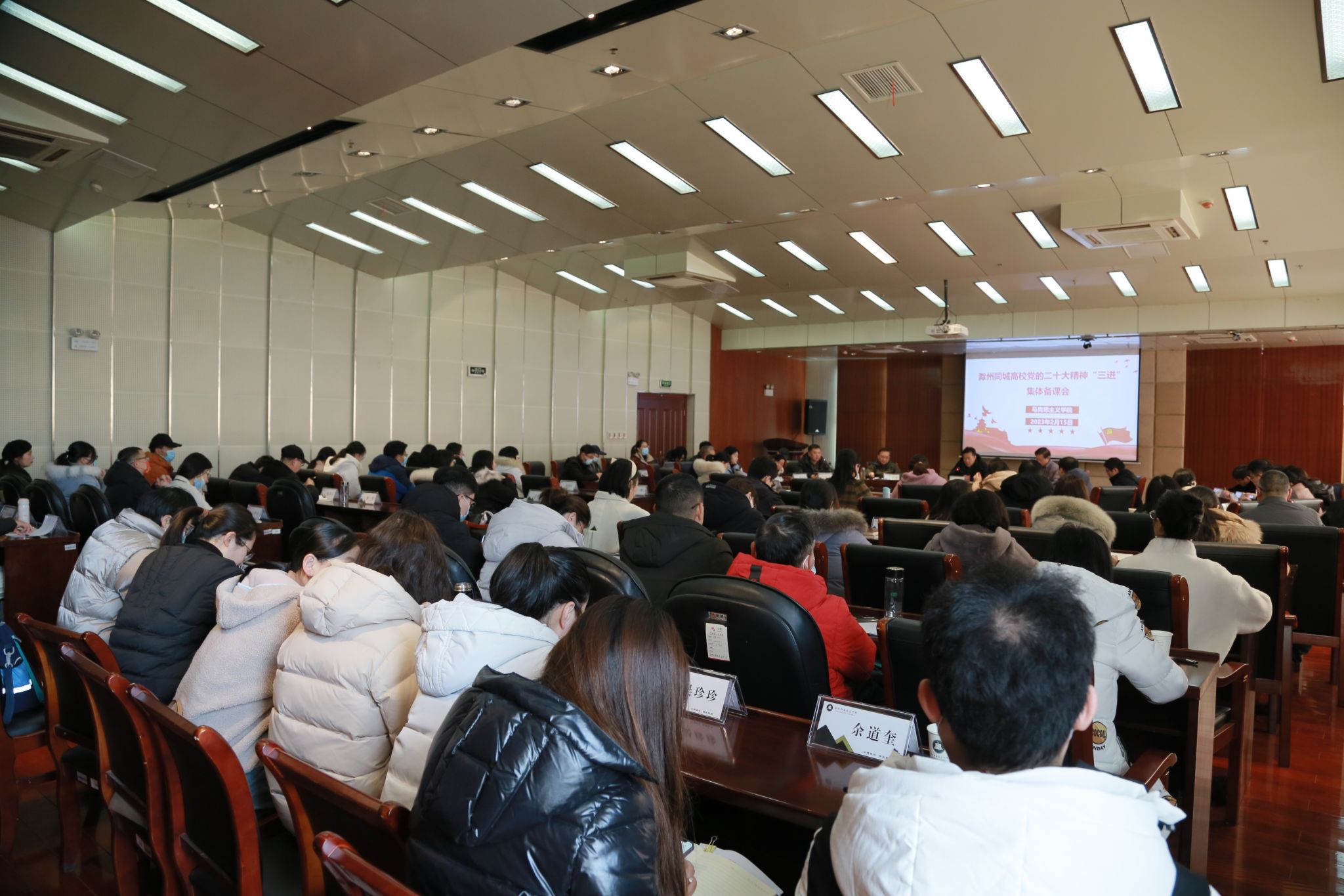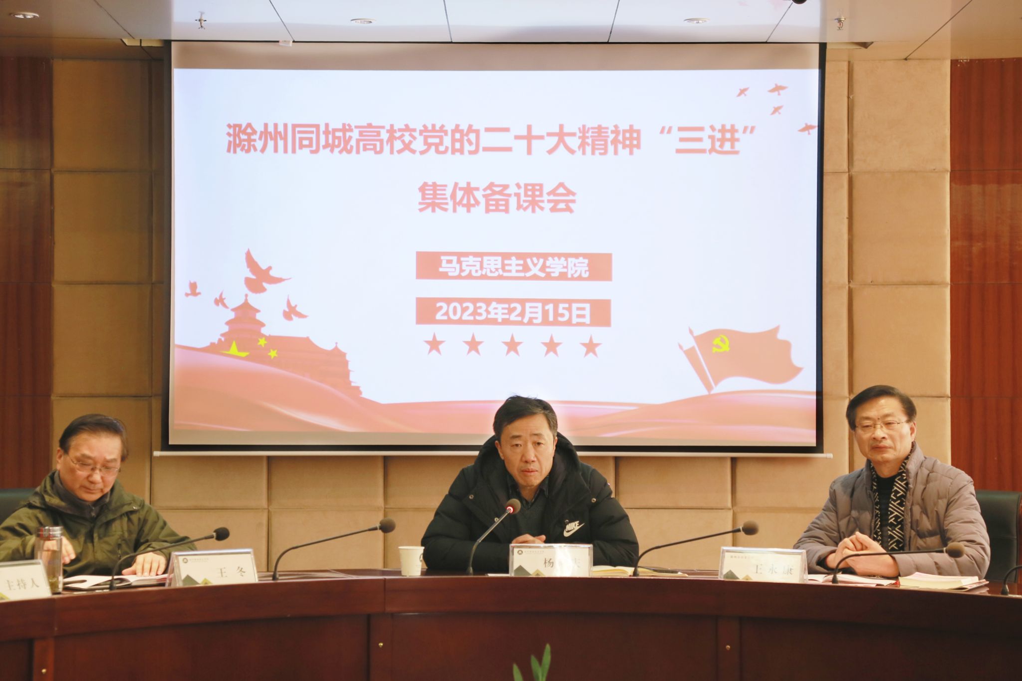 为了帮助思政课教师加深对党的二十大精神的理解和把握,进一步推进将党的二十大精神融入思政课程,2月15日,马克思主义学院牵头组织滁州同城高校党的二十大精神“三进”集体备课会,主题为“中国式现代化理论与实践融入高校思想政治理论课教学”。备课会邀请到滁州市委党校副校长王永康与会梳理点评,滁州学院马克思主义学院党总支副书记、副院长张静、滁州城市职业学院马克思主义学院党总支书记、院长季金年带队参加备课会。永利官网党委副书记杨家庆、党委委员、基础部主任王冬出席会议并讲话。会议由马克思主义学院副院长孔金主持,地点在综合楼1102会议室,同城高校80余名思政课教师与会。
