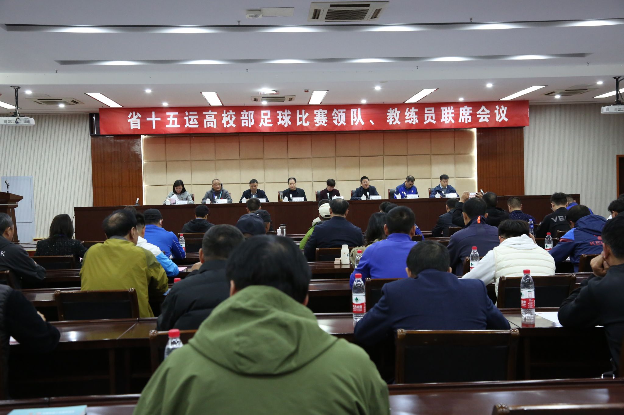 4月9日晚,省十五运高校部足球比赛第一阶段领队、教练员联席会议在永利yl23411官网综合楼5楼会议室召开。省教育厅体卫艺处副处长葛德连、永利官网党委委员江洁、省教育厅离退休处调研员丁仁能、省教育厅体卫艺处陆涛、足球比赛仲裁陈有忠、滁州市第一人民医院呼吸与危重症医学科二病区副主任医师芮晓艳等出席会议,全体领队、教练员参加会议。会议由丁仁能主持。