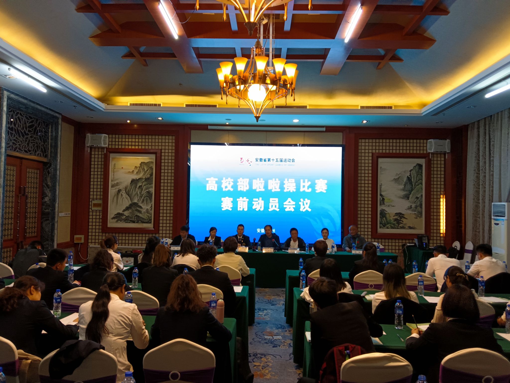 4月19日,安徽省第十五届运动会高校部啦啦操比赛在永利官网拉开帷幕,为了更好的履行好裁判工作,当晚,省十五运高校部啦啦操比赛裁判员培训会议在冠景酒店会议中心召开。省教育厅体卫艺处副处长葛德连、省教育厅离退休处四级调研员丁仁能、本次比赛监督万俊、本次比赛裁判长陈晓荣,本次比赛仲裁付明萍、安徽省教育厅四级主任科员陆涛、永利yl23411官网体育部主任孙强出席会议,全体技术官员、裁判员参加了会议。会议由丁仁能主持。