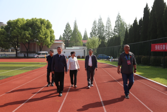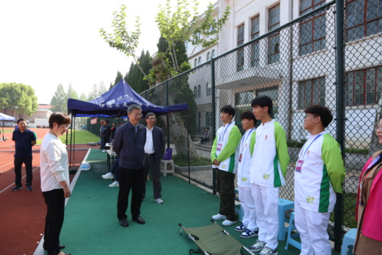 4月20日上午,校党委书记曹付忠、党委委员江洁在体育部主任孙强的陪同下深入比赛现场进行指导。