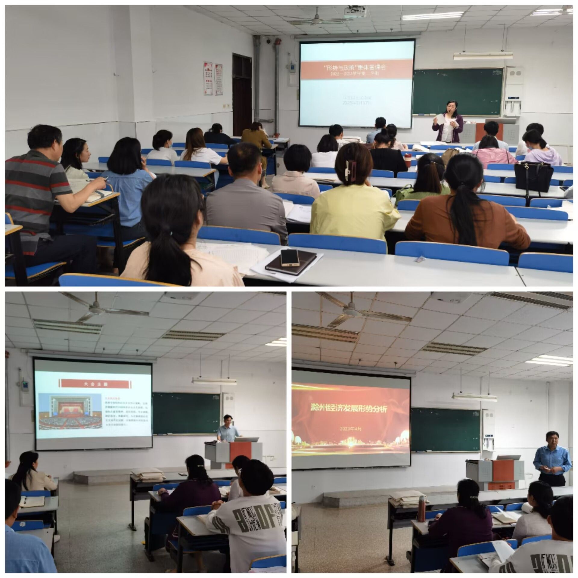 会上,张家莉介绍本学期“形势与政策”课将由马克思主义学院负责统筹、各教学院部负责组织实施,教学安排依然采取的是“校领导+总支书记+辅导员+思政课教师”模式组织“形策”课,对课程开设做了相关工作要求,提出二级学院在课程开设中如遇到问题或者困难都可以找马克思主义学院协调解决。随后,马克思主义学院在1101教室召开“形势与政策”课集体备课会,本次课程教学的相关开课教师参加,孔金、张家莉和汪立超三位老师先后就《深入学习贯彻党的二十大精神》《学习贯彻习近平总书记教育重要论述讲义》《滁州经济社会发展形势》三个专题进行了备课内容汇报。