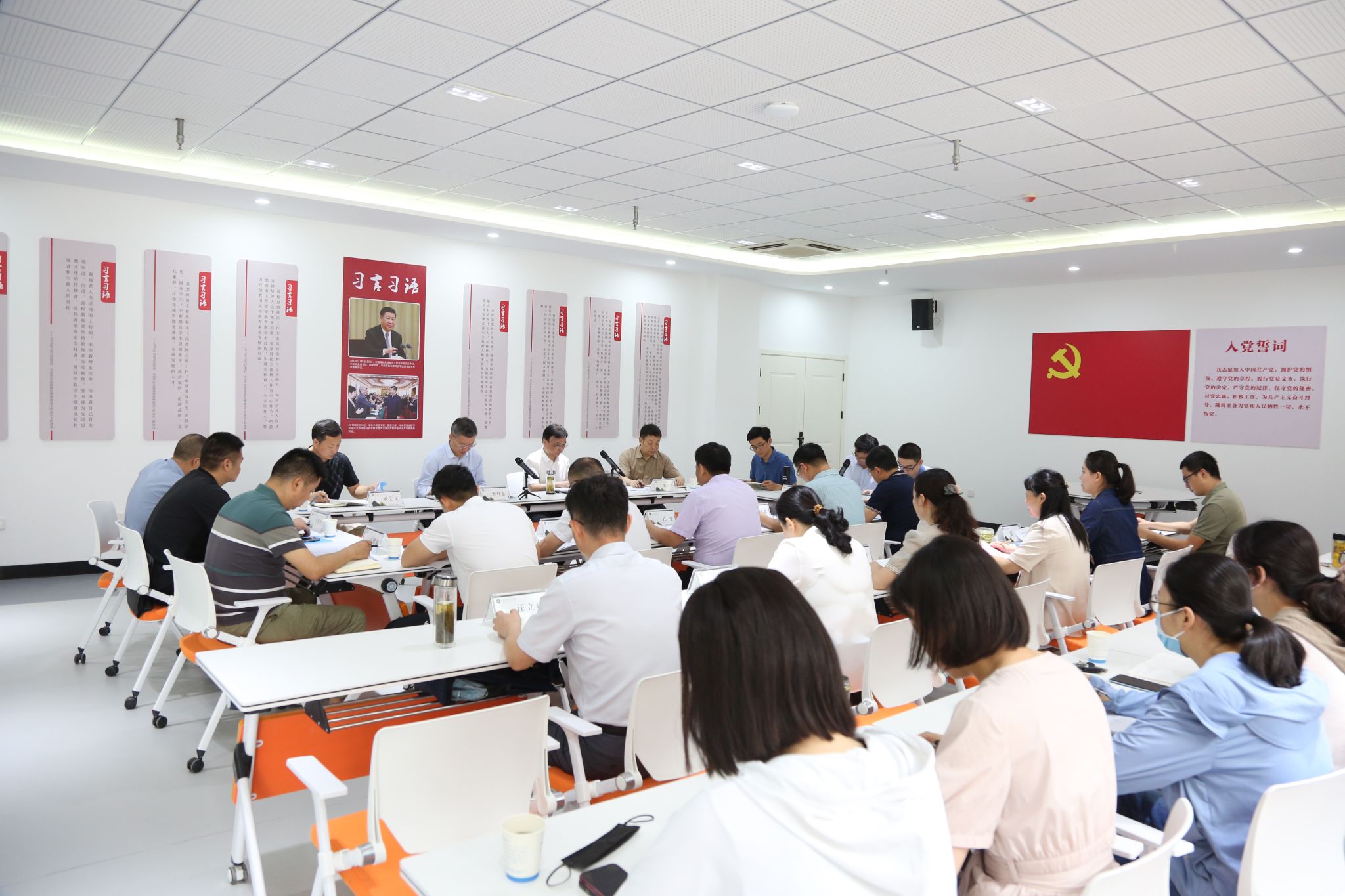 会上,马克思主义学院党总支书记、院长孔金从师资队伍、课程建设和教学科研等基本情况、取得的成绩、存在的问题和改进目标三方面汇报了思政课开设和马院建设情况;汪立超、付金凤、张燕三位教师代表分别围绕如何上好思政课、马克思主义学院在思政课建设上的举措、学校给予怎样的支持等方面进行发言;宣传统战部副部长吴成达汇报了沉浸式教学方法;教务处处长唐义武在肯定马克思主义学院教学管理规范的同时也指出了马克思主义学院在实际开展工作中存在的困难与劣势,并表示教务处会全力支持马克思主义学院的各项工作;学生处处长张军建议要加强辅导员、思政课教师的融合合作,共同致力于一站式学生社区建设;团委书记甄帅呼吁学校各部门的合力需要进一步整合,要加强学生在校期间的思想引领;建筑工程学院党总支书记刘文元肯定思政阵地建设的不易,建议结合当下学生的思想状况增强“读书明智”版块;管理学院党总支书记耿学刚提议青年教师要加强学习,深入到学生中去,结合学生职业理想开展相关课程的讲授。