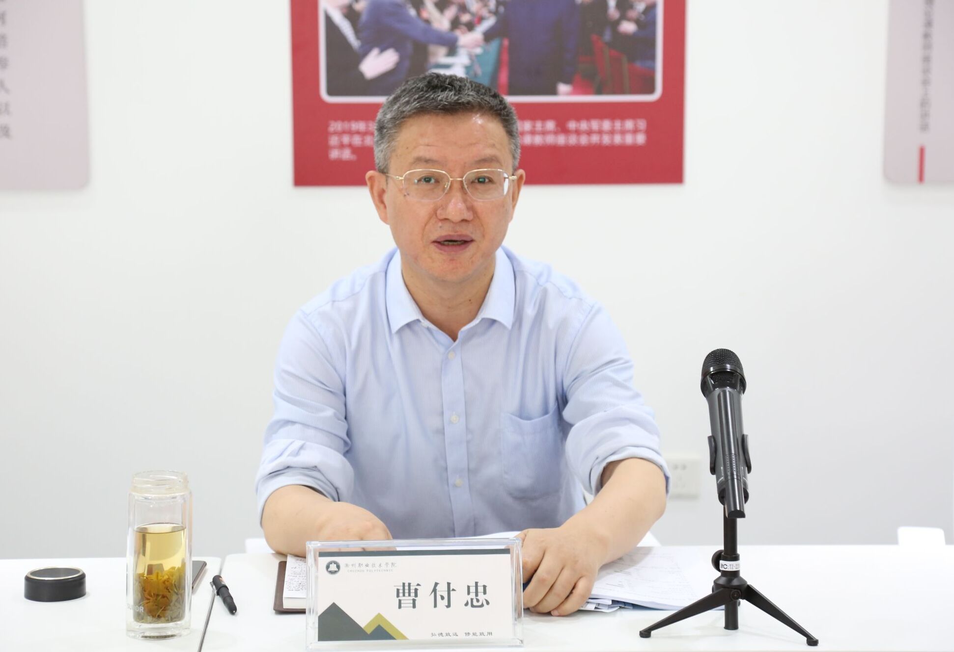 曹付忠在会上强调“立德树人”是新时代教育的根本任务,对于思政课教学:一是要提高对思政课育人重大意义的认识。增强思政课教师的荣誉感使命感责任感。二是要准确把握思政课的教学目标。以社会主义核心价值观为引领,提高政治理论素养,用党的创新理论武装头脑,弘扬以伟大建党精神为源头的中国共产党人精神谱系。要拓宽视野,突出重点,抓好思政课教学工作和思政课教师队伍建设,如加强思政课教师政治建设、加强思政课教师政治理论学习、提升思政课教师教学能力。三是要推进“大思政课”建设。用好第二课堂、志愿服务、劳动教育等渠道,建好校外实践教学基地,善用社会大课堂,构建大师资体系,实现“大师进校园、名师进课堂”,一体贯通课程思政和思政教学。四是加强领导,形成更大合力。思想政治工作涉及学校发展的方方面面,宣传统战部、学生工作处、教务处、团委、组织人事处、总务处等职能处室做好本部门职责范围的思政育人功能,齐心协力形成合力,做好协同育人。未来寄希望于马克思主义学院把握好当前的发展机遇,拉升标杆,创新作为,提质增量,为落实立德树人根本任务持续发力。