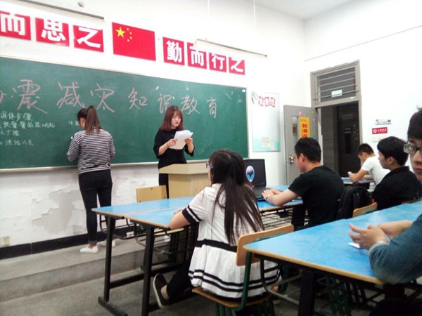 为进一步提学生的防震减灾意识,增强紧急避震能力,2016年5月18日晚上7:40分,传媒系学生会开展了以"抗震救灾知识教育"为主题的防震减灾科普知识宣传活动。学生会主席团、部长、干事参加了本次宣传活动。