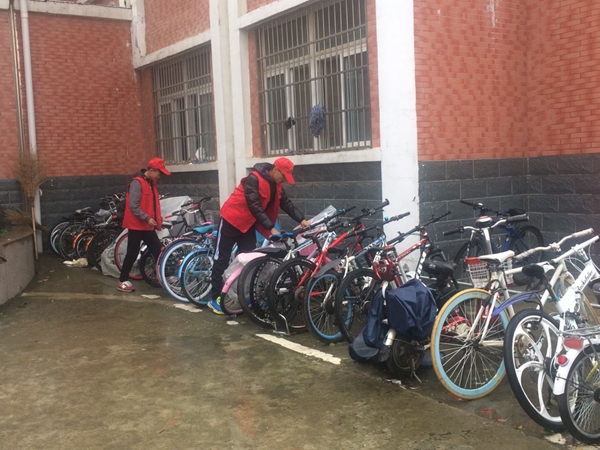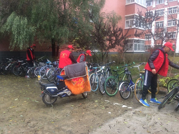 为了美化校园环境,提升同学素质,传媒系学生会艺术团人员在11月22日组织了摆放自行车活动。